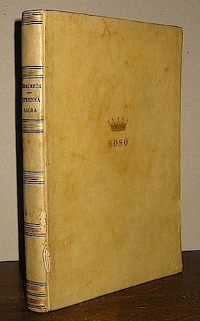 8vo (cm. 24,5), 6 cc.nn. in carta grave, ciascuna protetta da velina gialla con testo entro belle cornici colorate. Seguono 42 pp.nn., 11 pp., 5 pp.nn., 11 pp., 5 pp.nn., 12 pp., 4 pp.nn., 12 pp., 4 pp.nn., 132 pp.nn. tutte con testo entro cornice tip.monocromatica. Legatura coeva in piena pergamena (piccola mancanza al margine del piatto anteriore e due minuscole lacune al ds.) con corona nobiliare impressa in oro al piatto anteriore. Fili oro e in nero al ds. con titolo in oro. Interni ottimi.