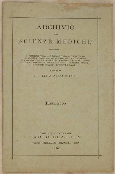In 8. Dim. 23x15,5 cm. Pp. da 297 a 327+(3). Interessante estratto del 1890 della serie "Archivio per le scienze mediche" diretto da G. Bizzozero" del dott. Fausto Faggioli "Studi di farmacologia comparata sul ferro e metalli affini" L'autore descrive diverse esperienze. Alla fine bella litografia con numerose figure. In buone condizioni. Copertina editoriale in buone condizioni generali con lievi usure ai margini e dorso. Legatura in buone condizioni. All'interno le pagine si presentano in ottime condizioni con rare fioriture. Piccole usure e gore d'umidità al margine superiore. Interesting extract of 1890 of the series "Archivio per le scienze mediche" directed by G. Bizzozero" del dott. Fausto Faggioli "Studies of pharmacology compared with iron and similar metals". The author describes different experiences. Beautiful lytograph with different illustrations in the end. In good conditions. Editorial cover in good general conditions slightly worn in the edges and spine. Binding in good conditions. Inside pages are in very good conditions with occasional foxings. Little wearings and humidity stains in the upper edge.