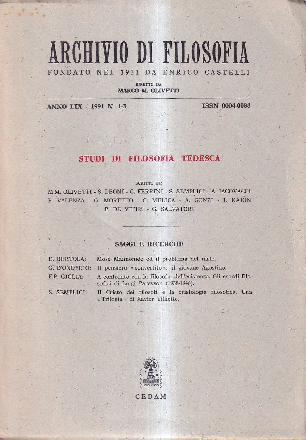 "Archivio di Filosofia" fondato nel 1931 da Enrico Castelli, diretto da Marco M. Olivetti. Anno LIX, 1991, n. 1-3 - Brossura editoriale di 419 pagine. Lievi segni del tempo esterni, peraltro ottima copia, poco o nulla consultata -- Scritti di M.M. Olivetti, S. Leoni, C. Ferrini, S. Semplici, A. Iacovacci, P. Valenza, G. Moretto, C. Melica, A. Gonzi, I. Kajon, P. De Vitiis, G. Salvatori. Saggi e ricerche: E. Bertola, "Mosè Maimonide e il problema del male" - G. D'Onofrio, "Il pensiero "convertito": il giovane Agostino - F.P. Giglia, "A confronto con la filosofia dell'esistenza. Gli esordi filosofici di Luigi Pareyson (1938-1946) - S. Semplici, "Il Cristo dei filosofi e la cristologia filosofica. Una "Trilogia" di Xavier Tilliette.