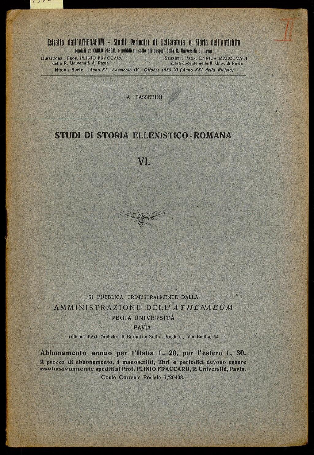 Opuscolo vintage. Estratto dall' ATHENAEUM - Studi Periodici di Letteratura e Storia dell'antichita ali a CLO PASCUL latinita pilnpid teler ita di Pavia Ser: P. Ordinario segno del tempo
