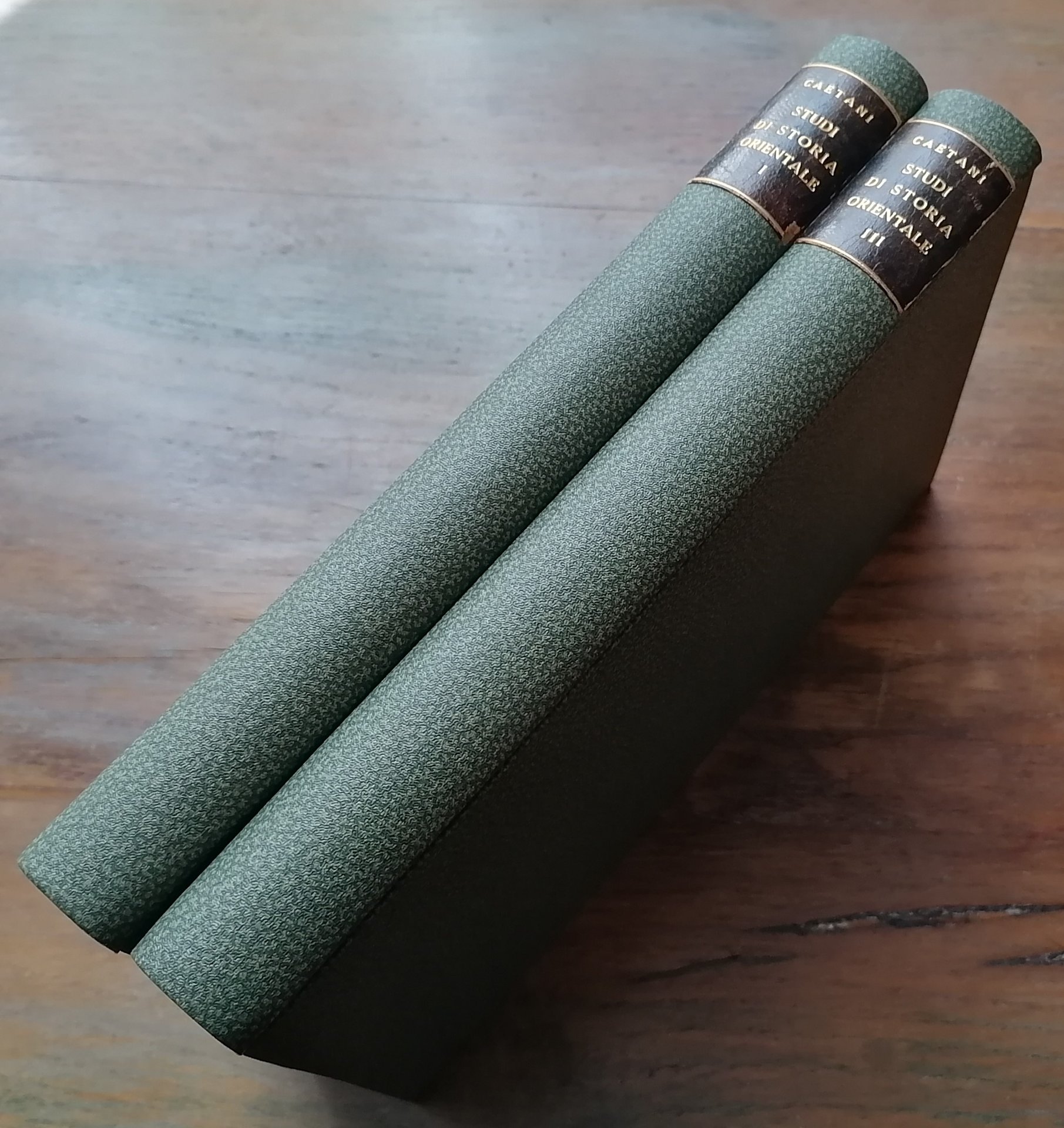 (Orientalistica; Islamologia; Arabistica; Oriente musulmano) Due volumi in 8°, legatura coeva in piena percallina verde, ai dorsi tasselli in pelle nera con titoli in oro, tagli di testa colorati. Gli "Studi" furono progettati dall'autore come opera divulgativa in cui raccogliere le conclusioni del lavoro documentario degli "Annali dell'Islam", erano previsti anche un volume secondo e quarto ma solo il primo e terzo volume furono pubblicati in vita dal Caetani. Volume I : 1911, pp. XV,(1),419,(1), con 5 cartine geografiche a colori fuori testo. Volume III : 1914, pp. IX,(1),431,(1), con 1 carta geografica a colori fuori testo. Volumi in edizione originale, in ottimo stato di conservazione.