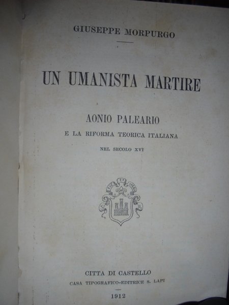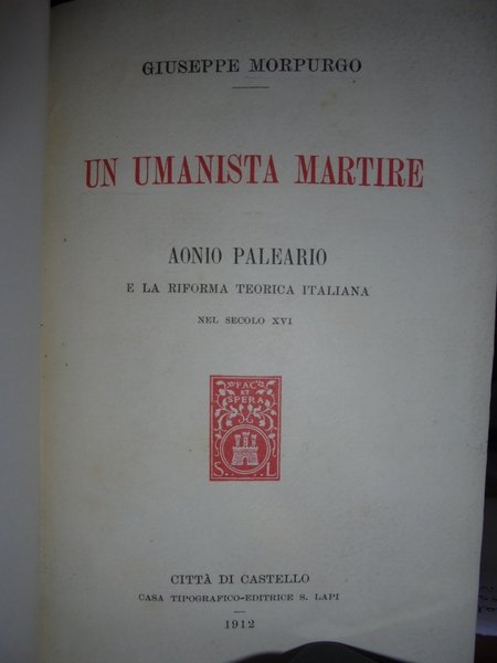 (Studi esoterici e religiosi) Giuseppe Morpurgo. Città di Castello, Casa Tipografico-Editrice S. Lapi, 1912. UN UMANISTA MARTIRE. AONIO PALEARIO e la riforma teorica italiana nel Secolo XVI. In-16°, tela con titolo in oro entro tassello al dorso. Le copertine originali sono conservate. 350 pp. In ottimo stato di conservazione. Neg. U.T.E.T. mob. 8