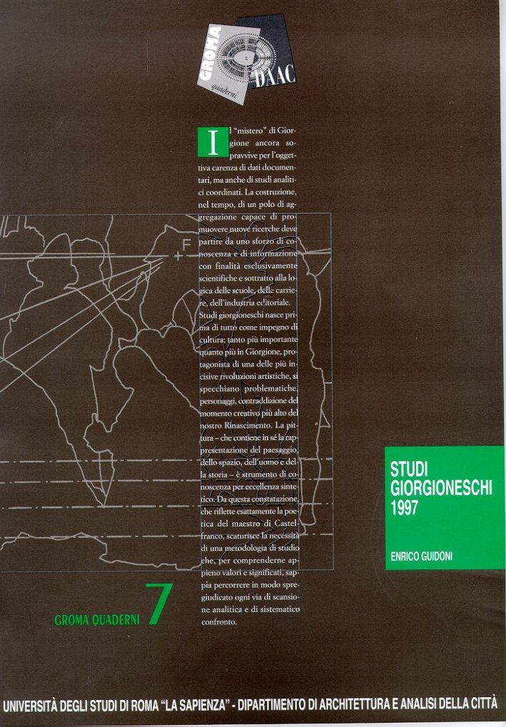 Roma, 1998; br., pp. 60, ill. b/n num. n.t., 7 tavv. col. num. n.t., cm 21x29,5. (Studi Giorgioneschi). (Arte e archeologia). (Studi giorgioneschi. Annuario di ricerche sull'arte del Rinascimento. Collana a cura di Enrico Guidoni. 1). (Università degli Studi di Roma La Sapienza. Dipartimento di architettura e analisi della città. Collana diretta da Raffaele Panella. 7).