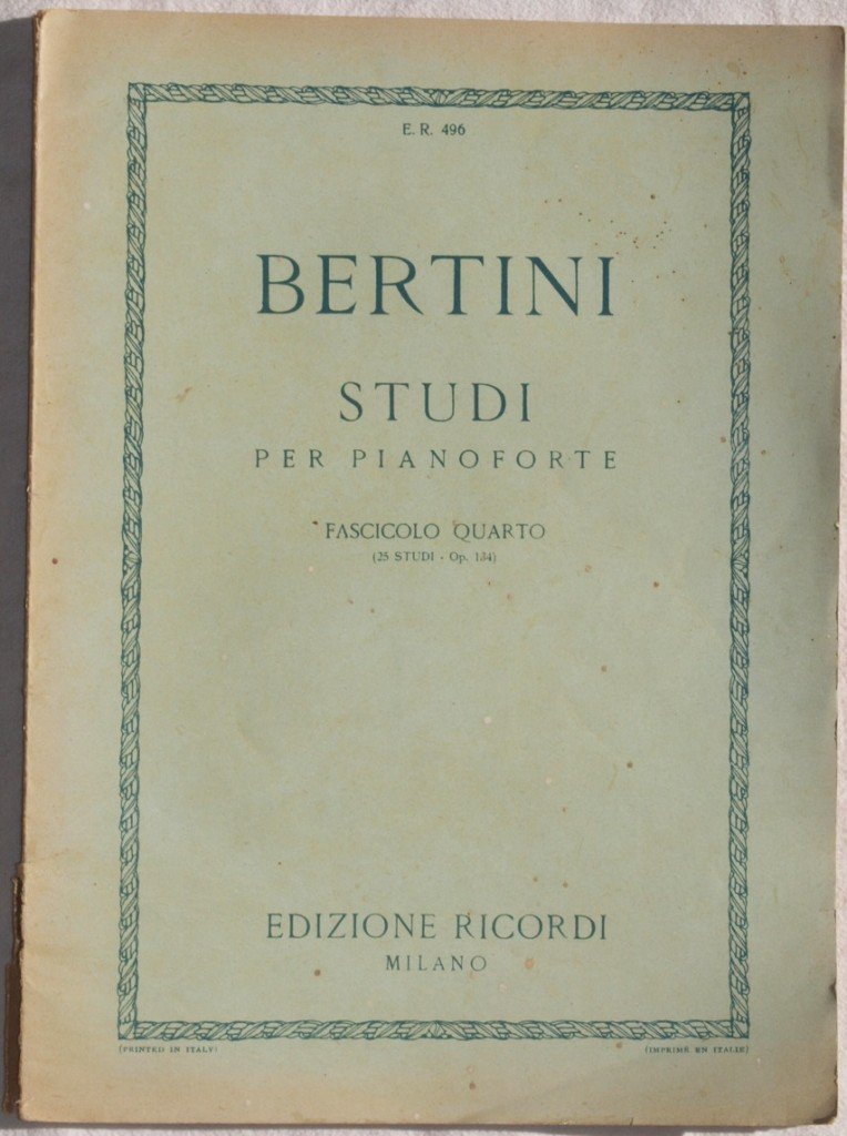 In 4. Dim. 32x23,5 cm. Pp. 81. Edizione del 1942 di questa interessante opera musicale di Henri Bertini (1798-1876) compositore e pianista francese. Il volume, fascicolo quattro, contiene una serie di studi per pianoforte dall'opera 134 di Bertini. Edizione riveduta da Bruno Mugellini. Brossura editoriale decorata. In buone condizioni. Brossura editoriale in buone condizioni generali con lievi usure ai margini e dorso. Legatura in buone condizioni. All'interno le pagine si presentano in ottime condizioni con rare fioriture. Edition of 1942 of thsi interesting musical work by Henri Bertini (1798-1876) french pianist and composer. The volume, pamphlet four, contains a series of studies for piano of the work 134 of Bertini. Reviewed edition by Bruno Mugellini. Editorial original cover. In good conditions. Editorial cover in good general conditions slightly worn in the edges and spine. Binding in good conditions. Inside pages are in very good conditions with occasional foxings.