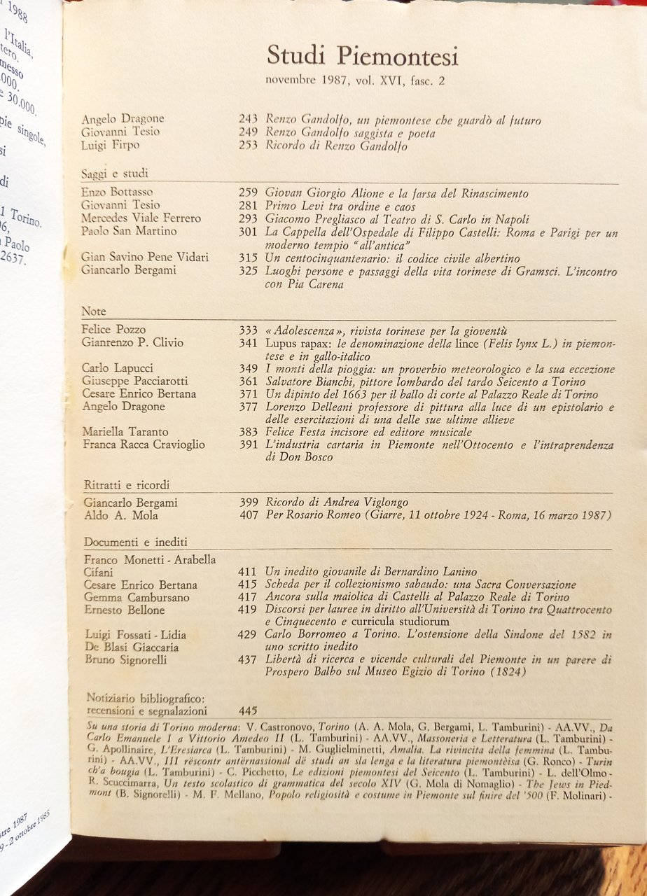 Vol. XVI, fasc. 2 della rivista semestrale. Indice: Angelo Dragone, Renzo Gandolfo, un piemontese che guardò al futuro - Giovanni Tesio, Renzo Gandolfo saggista e poeta - Luigi Firpo, Ricordo di Renzo Gandolfo - Saggi e studi (Enzo Bottasso, Giovan Giorgio Alione e la farsa del Rinascimento - Giovanni Tesio, Primo Levi tra ordine e caos - Mercedes Viale Ferrero, Giacomo Pregliasco al Teatro di S. Carlo in Napoli - Paolo San Martino, La Cappella dell'Ospedale di Filippo Castelli:Roma e Parigi per un moderno tempio all'antica" - Gian Savino Pene Vidari, Un centocinquantenario: il codice civile albertino - Giancarlo Bergami, Luoghi persone e passaggi della vita torinese di Gramsci. L'incontro con Pia Carena) - Note (Felice Pozzo, "Adolescenza", rivista torinese per la gioventù - Gianrenzo P. Clivio, "Lupus rapax": la denominazione della lince (Felis lynx L.) in piemontese e in gallo-italico - Carlo Lapucci, I monti della pioggia: un proverbio meteorologico e la sua eccezione - Giuseppe Pacciarotti, Salvatore Bianchi, pittore lombardo del tardo Seicento a Torino - Cesare Enrico Bertana, Un dipinto del 1663 per il ballo di corte al Palazzo Reale di Torino - Angelo Dragone, Lorenzo delleani professore di pittura alla luce di un epistolario e delle esercitazioni di una delle sue ultime allieve - Mariella Taranto, Felice Festa incisore ed editore musicale - Franca Racca Cravioglio, L'industria cartaria in Piemonte nell'Ottocento e l'intraprendenza di Don Bosco) - Ritratti e ricordi (Giancarlo Bergami, Ricordo di Andrea Viglongo - Aldo A. Mola, Per Rosario Romeo (Giarre, 11 ottobre 1924-Roma, 16 marzo 1987)) - Documenti e inediti (Franco Monetti-Arabella Cifani, Un inedito giovanile di Bernardino Lanino - Cesare Enrico Bertana, Scheda per il collezionismo sabaudo: una Sacra Conversazione - Gemma Cambursano, Ancora sulla maiolica di Castelli al Palazzo Reale di Torino - Ernesto Bellone, Discorsi per lauree di Diritto all'Università di Torino tra Quattrocento e Cinquecento e "curricula studiorum" - Luigi Fossati-Lidia De Blasi Giaccaria, Carlo Borromeo a Torino. L'ostensione della Sindone del 1582 in uno scritto inedito - Bruno Signorelli, Libertà di ricerca e vicende culturali del Piemonte in un parere di Prospero Balbo sul Museo Egizio di Torino (1824)) - Notiziario bibliografico: recensioni e segnalazioni - Notizie e asterischi (Attività del C.S.P. - Asterischi (a cura di A. Malerba)) - Libri ricevuti. In-8, pp. 2 nn.+243-520+12 pubblicitarie in b/n, bross. illustrata in rosso (Insegna del Centro tratta da una tavola del "Recetario de Galieno", stampato da Antonio Ranoto a Torino nel MDXXVI. Con illustrazioni in b/n in tavole f. t. Consulente grafico: Giovanni Brunazzi. Stato buono (parzialmente intonso - leggero stato di usura della copertina ai margini - al margine sinistro della quarta di copertina strappo di ca. 2.3 cm - appunto a matita in quarta di copertina facilmente cancellabile)"