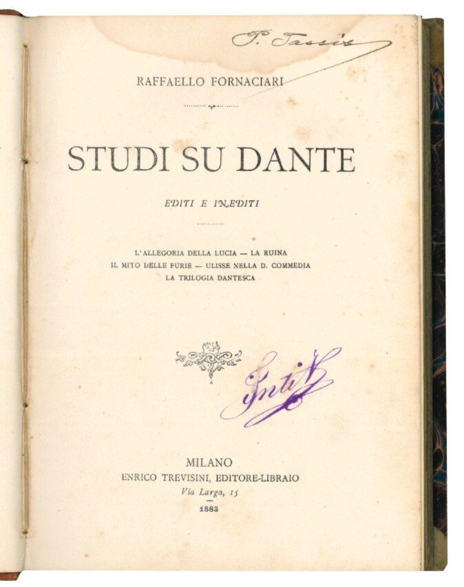 Mm. 185x130. Pp. VI, 188, [2]. Con testatine, finalini e piccole iniziali tipografiche. Cc. lievemente ed uniformemente brunite, alle prime cc. lieve alone marginale. Firme di possesso al frontespizio del Prof. Pietro Tassis e annotazioni manoscritte alla c. di sguardia finale. Mezza pelle posteriore con decorazioni e titolo in oro incise al dorso. Lievi mancanze alle punte e alle cerniere, ex-libris al contropiatto anteriore. Prima edizione. Comprende studi su: L'allegoria della Lucia - La Ruina - Il Mito delle Furie - Ulisse nella Commedia - La Trilogia Dantesca.
