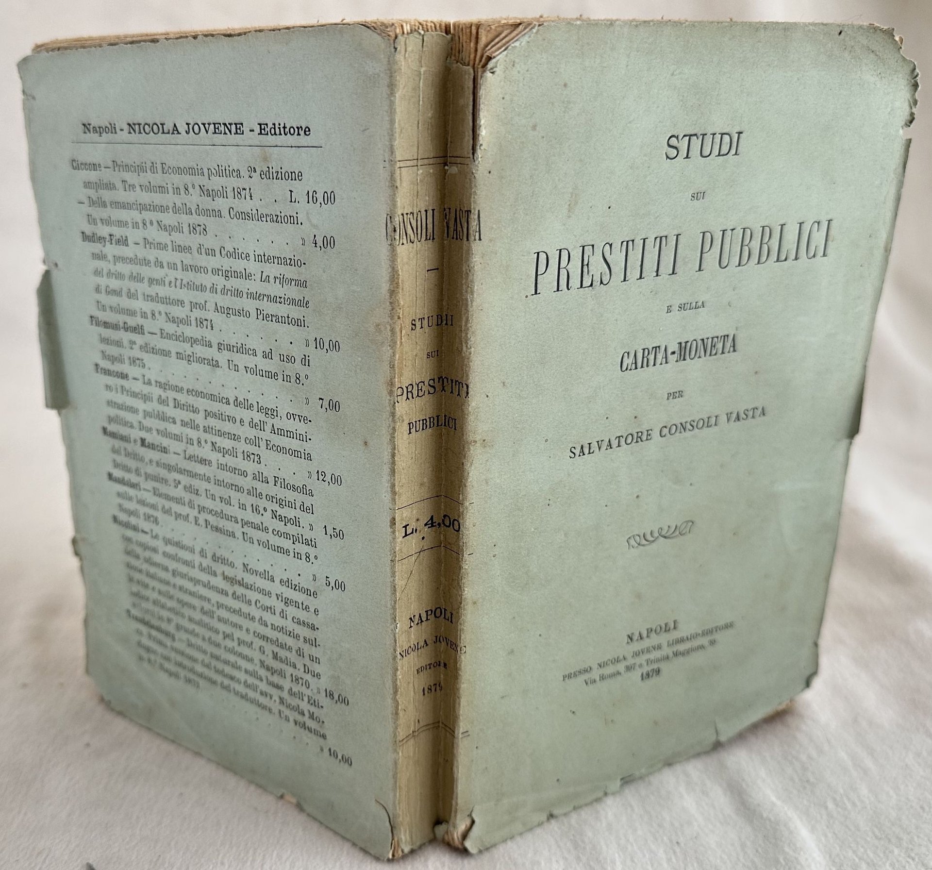 Interessante monografia del 1879 di diritto su Salvatore Consoli Vasta. Si tratta di uno studio sui prestiti pubblici e sulla carta moneta. All'interno: dei prestiti pubblici (Tra i quali: natura e varieta' de' prestiti pubblici; stato finanziario d'Italia dal 1860 al 1872; differenze tra l'imposta e il prestito); della carta moneta (Tra i quali: differenza tra il biglietto di banca e la moneta metallica, "bill" del 1844; sistema di law e altri sistemi fondati sopra una circolazione ordinaria di carta; il cambio internazionale; storia della carta moneta in: francia, Inghilterra, Russia, Austria, America, Italia. Il corso forzoso in Italia dal 1870 al 1875; discussione in parlamento nel maggio 1876 tra i partigiani e gli avversari dell'unita' dell banca; il progetto "Depretis"). In ottime condizioni. Copertina editoriale in discrete condizioni con lievi usure ai margini e dorso. Legatura in buone condizioni. Pagine in buone condizioni con fioriture. In 8. Dim. 19,5x12,5 cm. Pp. IV+348. Peso Kg. 0,288Interesting monography of 1879 of right by Salvatore Consoli Vasta. It is a study about public loans and money. Inside: dei prestiti pubblici (Tra i quali: natura e varieta' de' prestiti pubblici; stato finanziario d'Italia dal 1860 al 1872; differenze tra l'imposta e il prestito); della carta moneta (Tra i quali: differenza tra il biglietto di banca e la moneta metallica, "bill" del 1844; sistema di law e altri sistemi fondati sopra una circolazione ordinaria di carta; il cambio internazionale; storia della carta moneta in: francia, Inghilterra, Russia, Austria, America, Italia. Il corso forzoso in Italia dal 1870 al 1875; discussione in parlamento nel maggio 1876 tra i partigiani e gli avversari dell'unita' dell banca; il progetto "Depretis"). In good conditions. Editorial cover in fair condition lightly worn in the extremities and spine. Binding in good conditions. Pages are in good conditions with foxing. In 8. Dim. 19,5x12,5 cm. Pp. IV+348. Peso Kg. 0,288