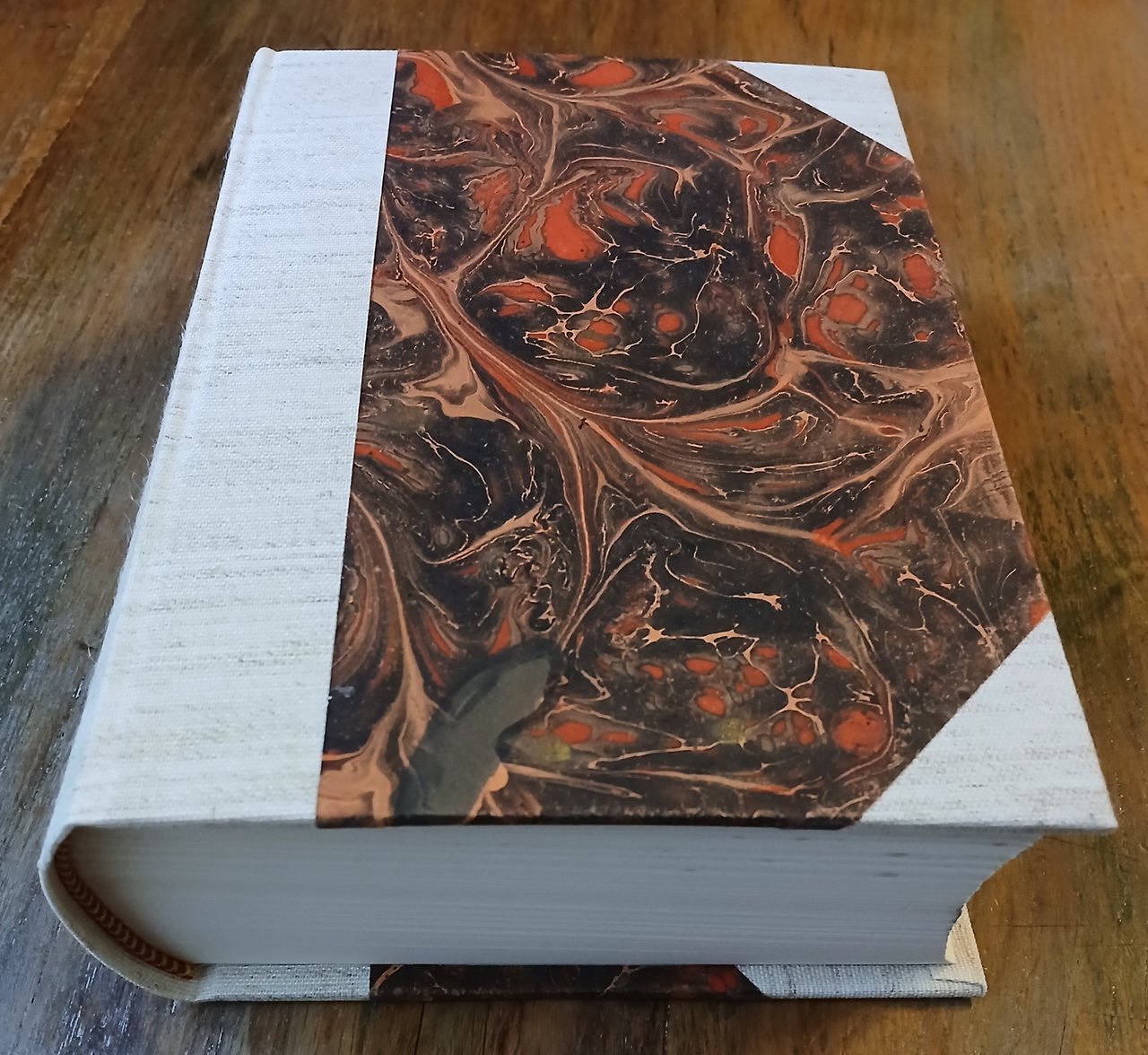 - legatura in mezza tela con punte, tassello in pelle con titoli dorati al dorso, carta marmorizzata ai piatti