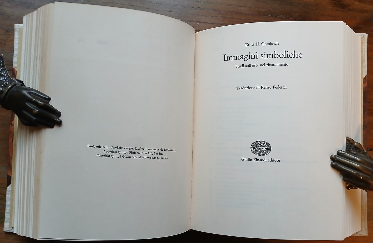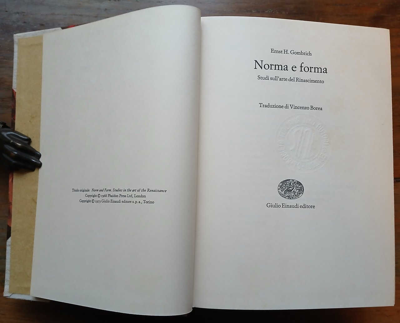 Collana "Saggi" (504 - 589). Due volumi riuniti in un tomo in 8°, legatura in mezza tela con punte, tassello in pelle con titoli dorati al dorso, carta marmorizzata ai piatti. "Norma e forma", 1973, pp. XXII,241,(13), con 186 illustrazioni in bianco e nero su tavole fuori testo. Traduzione di Vincenzo Borea. "Immagini simboliche", 1978, pp. XXIV,335,(11), con 175 illustrazioni in bianco e nero su tavole fuori testo. Traduzione di Renzo Federici. Ottimo stato.