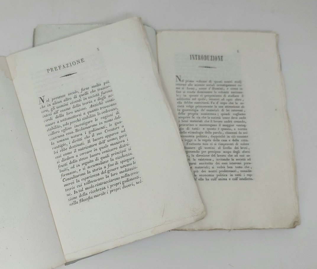 >2 volumi in-8 (230x152 mm), 1) pp. 16, di Prefazione dell'Autore. 2) pp. 54. Brossure originali a stampa (lievi aloni d'umido). Importante saggio di economia-politica del grande economista ginevrino (1773-1842). Negli anni 1837-1839 pubblicò una raccolta di saggi di politica, economia e sociologia, tradotti per la prima volta in italiano dal ravennate Orioli (Ravenna, Tip. Roveri, 1839-41). Esemplare speciale, corredato da un volumetto di Prefazione, stampata a parte rispetto all'opera. Su carta forte, intonso.