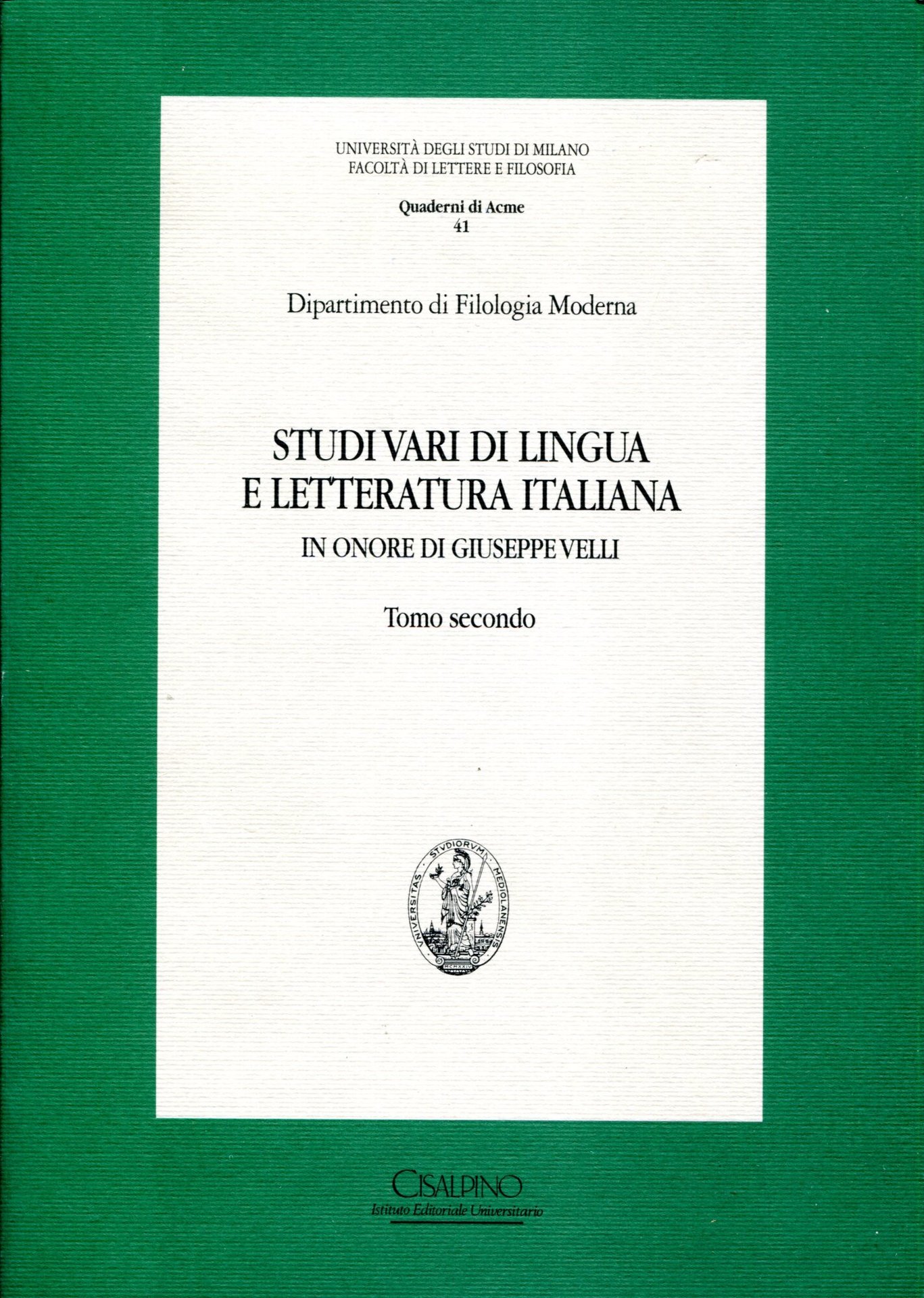 Studi vari de lingua e letteratura italiana. In onore di Giuseppe Velli. Tomo primo e secondo