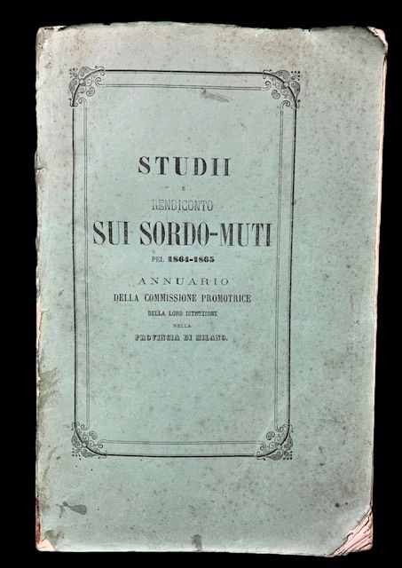 In 8°, (4), 216, (2) pp. Bella brossura editoriale con titolo in nero al piatto anteriore entro cornice e al recto incisione con alfabeto manuale dei sordo-muti (dorso rifatto piccola mancanza al margine absso del piatto anteriore). A parte il difetto al droso in bune condizioni di conservazione. Prima rara edizione dei celebri rendiconti siui Sordo-Muti. L'opera raccoglie vari articoli a tema sordo-muti fra i quali: programma generale dell'insegnamento ai sordo-muti del cavalier Don Giulio Tarra, Delle modalità legali per il consenso dei sordo-muti in materia giuridica, Statistica dei sordo-muti in Sicilia, Regio Istituto dei Sordo-muti di Siena, Istruzioni ai sordo-muti nelle scuole primarie di Blanchet, Legame di consanguineità e mutolezza, Cenni sulla storia ed i principi d'istruire i sordo-muti di Leone Vaisse, Parola resa ai sordo-muti, Disegno e istruzione di Bozoli e Bravetti, Dell'Istituto di Lodi, Como, Cremona, Pavia, Milano, Catanzaro, Melbourne, Progetto scuola per sordo-muti a Malta, Procedura correzzionale di un sordo-muto a Sondrio, Sordo-muti a Brescia, Risultato del processo al sordo-muto Antonio Cappello ecc. Non comune trattato. Prima edizione.