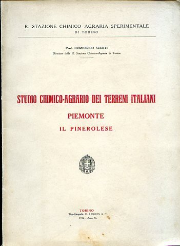 In-8°, pp. 77, brossura edit. Tabelle. Tre carte f.t., di cui tre ripiegate a colori, relative alla geologia, all'acidimetria e alla calcimetria del pinerolese, ed una in b.n. all'antiporta. Lo Scurti fu direttore della Stazione Chimico-Agraria di Torino.