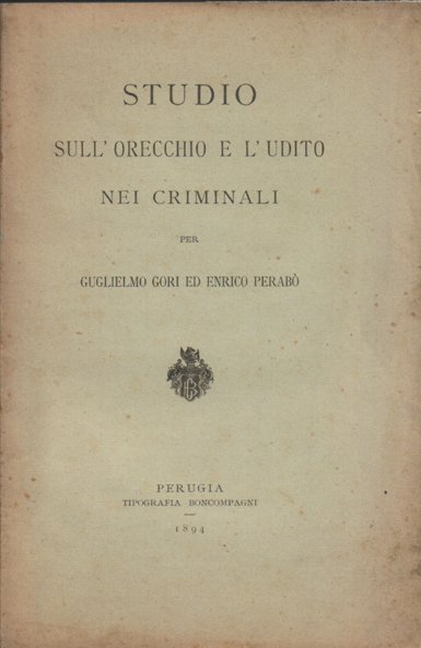 In-8°, pp. 41, (3), copertina editoriale. Raro opuscolo. Dalla prefazione degli autori: "Questa volta l'iniziativa del nostro lavoro è venuta dall'amico Perabò. Entusiasti ambedue degli studi forti e geniali della nuova scuola antropologico-criminale, egli ogni volta che si recava nella sala anatomica per gli esercizî di dissezione scrutava nei cadaveri tutte le anomalie che lo potessero interessare e mi comunicava subito le sue osservazioni. Fu così che un giorno il suo professore di'anatomia, Valenti, gentilmente gli permise di asportare le orecchie dal cadavere di un galeotto, orecchie anormali per le dimensioni grandissime e per la forma ad ansa. Questo fu il principio di una vera orecchiomania: accumulammo osservazioni, dati statistici, teorie e finimmo con l'idea di pubblicare uno studio sull'argomento".