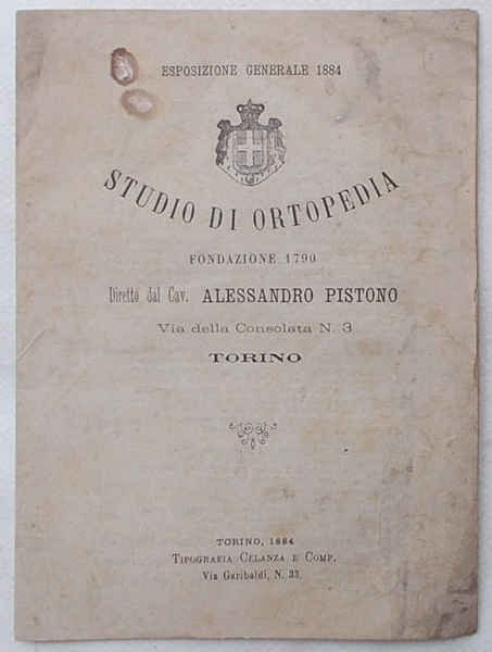 In 16° (cm. 18 x 13,5); pagg. 15; brossura originale un po' impolverata. VG-. ** Realizzato in occasione della Espoisizione Generale 1884 di Torino.Contiene "notizie popolari" di ortopedia, l'elenco degli apparati ortopedici "tutti di produzione nazionale" disponibili, l'orario "non festivo", ecc.