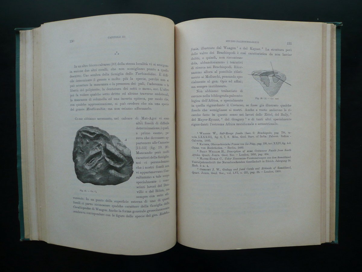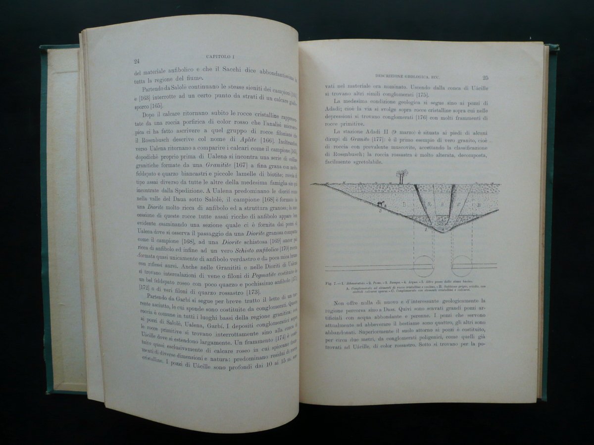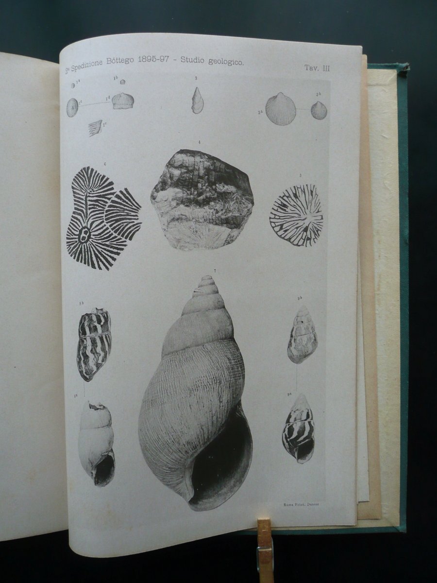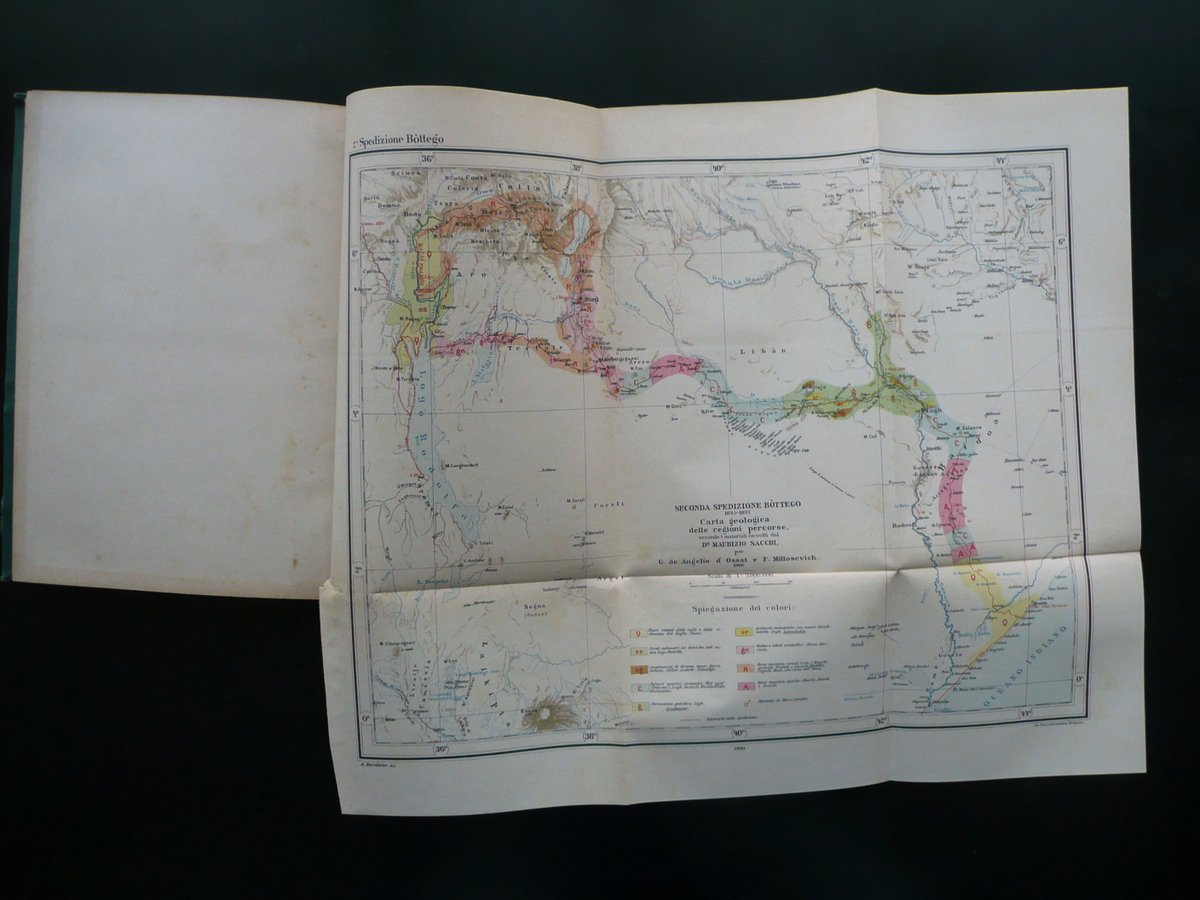 G. De Angelis d'Ossat e F. Millosevich, Seconda Spedizione Bòttego - Studio Geologico sul materiale raccolto da M. Sacchi Società Geografica Italiana, Roma 1900, cm 24,5x17,5, pp. 212 con 25 fig. in b/n n. t., IV tavole in b/n f. t., una carta a col. rip. più volte al termine del testo, e un ritratto fot. in b/n del Sacchi all'antiporta. Legatura in tutta tela con titolo impresso in oro al dorso. Condizioni di conservazione Esemplare in buone condizioni con tracce d'uso; coperta con alcuni lievi aloni e difetti, margine est. del piatto ant. e cuffie con poche piccole mancanze; dorso con lievissimo accenno d'ingiallimento e piccole tracce di precedente etichetta applicata alla cuffia sup. Interni buoni con poche lievissime bruniture ad alcune pagine; un margine della carta ripiegata con una pieghetta e un minimo strappetto. Con 25 figure in bianco e nero nel testo, IV (4) tavole con relativa descrizione in bianco e nero fuori testo e una carta geologica a colori ripiegata più volte al termine del testo. SETT89.L8035 N