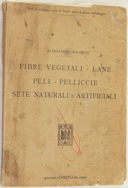 In 4. Dim. 32,5x23 cm. Pp. 430+(6). Peso Kg. 1,700. Edizione Hoepli del 1914 di questa opera tecnica sulle fibre vegetali e sete artificiali scritto da Alessandro Solaro. Si tratta di uno studio per il riconoscimento di fibre vegetali, lane, peli, pelliccie, sete naturali, sete artificiali con l'analisi quantitativa dei tessuti ed altri manufatti tessili. All'interno carfatteristiche e analisi di diverse fibre vegetali (cotone, lino, canapa sativa, ramiè, Sunn, Ginestra di Spagna, Gelsolino, juta, Ibisco, Agave, Jucca, Cocco, seta ecc.), fibre animali (pecora, astrakan, capra, martora, volpe, orso bruno, gatto domestico, di Russia, selvatico, Amster, coniglio ecc.), sete naturali, sete artificiali ecc. Numerose tabelle con studi di chimica. Numerose figure all'interno. Custodia cartonata editoriale originale. In buone condizioni. Copertina editoriale in buone condizioni generali con lievi usure ai margini e dorso. Custodia cartonata in discrete condizioni con parti mancanti e macchie. Legatura in buone condizioni. All'interno le pagine si presentano in ottime condizioni con rare fioriture.Hoepli edition of 1914 of this technical work about vegetal fibers and artificial silks written by Alessandro Solaro. It is a study for asknowledgement of vegetal fibres, wool, hairs, natural silks, artificial silks with quantitive analysis of tissues and other textiles. Inside carachetristics and analysis of different vegetal fibres (cotton, linen, canapa sativa, ramiè, Sunn, Ginestra di Spagna, Gelsolino, juta, Ibisco, Agave, Jucca, Cocco, seta ecc.), animal fibres (pecora, astrakan, capra, martora, volpe, orso bruno, gatto domestico, di Russia, selvatico, Amster, coniglio ecc.), natural silks, artificial silks ecc. Different charts with studies of chemistry. Different figures inside. Original editorial carton case. In good conditions. Editorial cover in good general conditions slightly worn in the edges and spine. Carton case in fair conditions with missing parts and stains. Binding in good conditions. Inside pages are in very good conditions with occasional foxings.