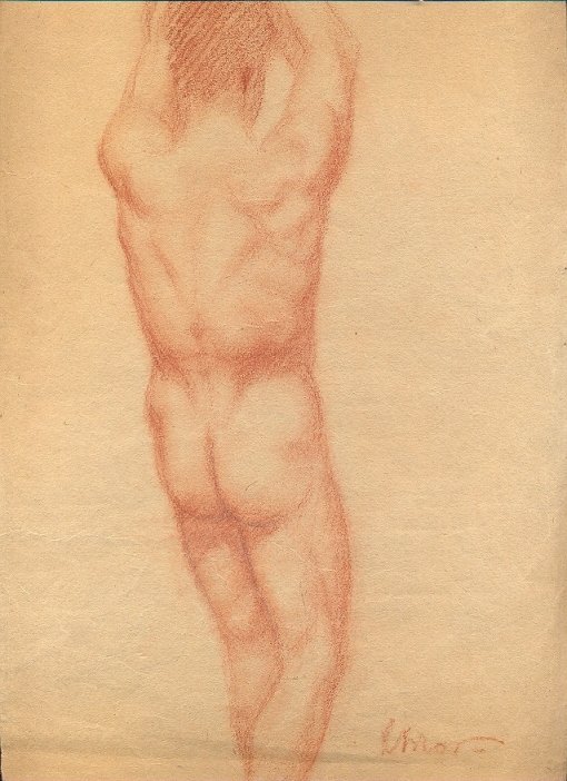 Sanguigna su carta di cm. 41 x 22. Firmato in basso a destra. Sul retro schizzo di studio anatomia animale.