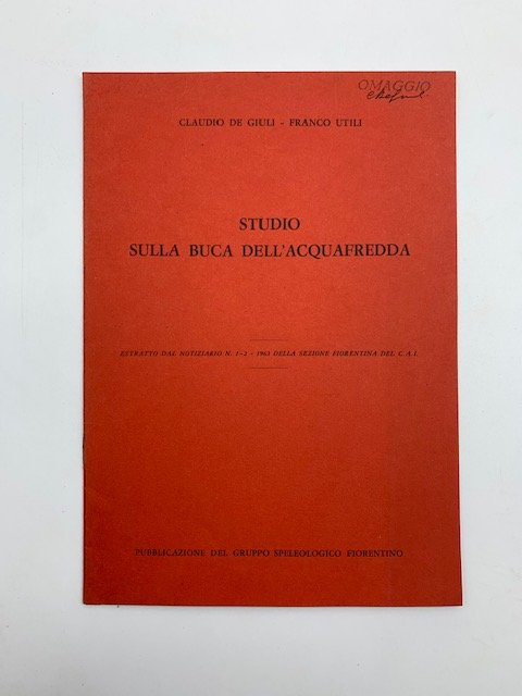 In 8, cm 17 x 24, pp. 6 con illustrazioni nel testo. Brossura editoriale. Invio autografo di De Giuli. Estratto editoriale dal Notiziario della sezione fiorentina del C.a.i. n. 1 - 2. 1963. Relazione dell'esplorazione di questa cavita' posta in localita' Forno (Massa C.)