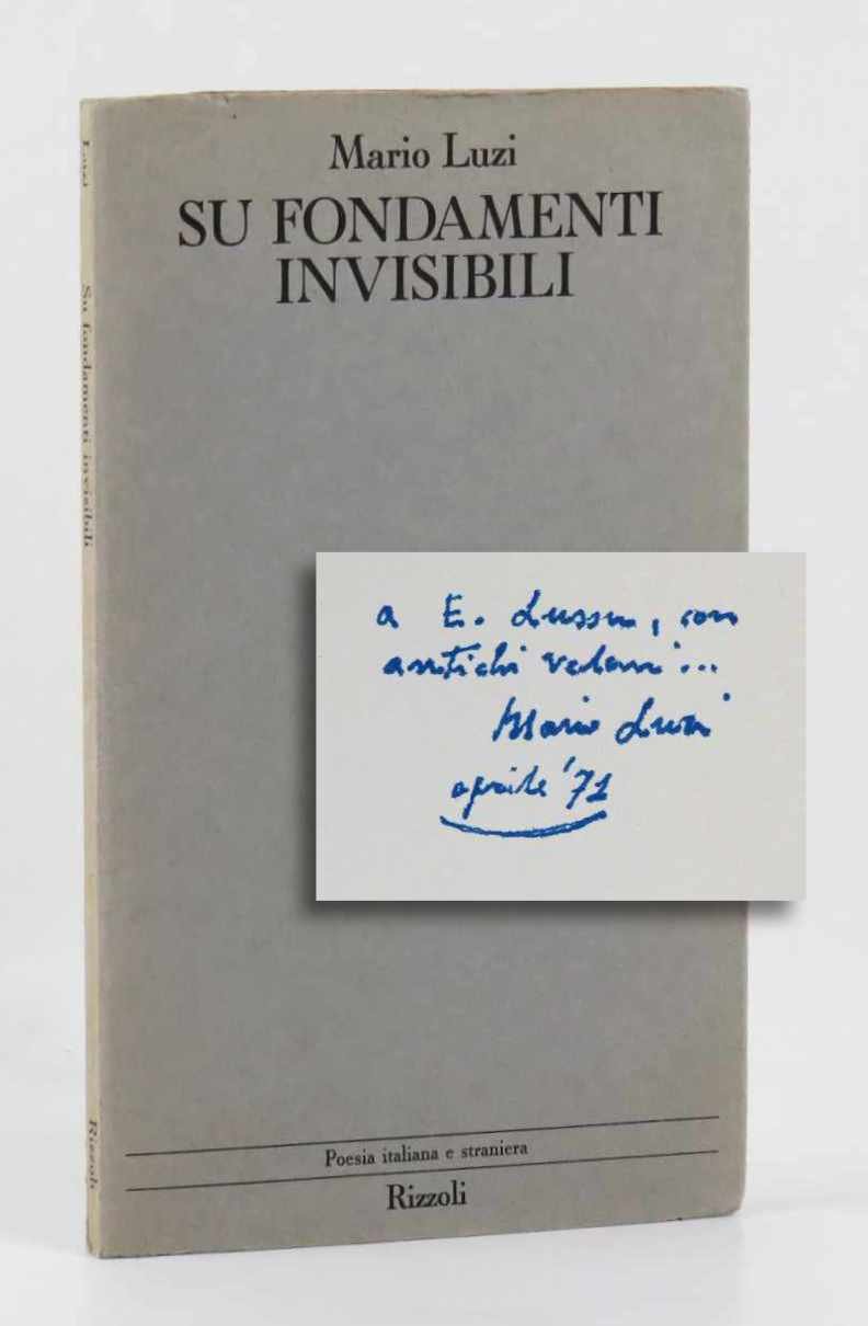 LIBROPrima edizione.CON AUTOGRAFO.Ottimo esemplare. Dedica autografa dell’autore a Emilio Lussu.«La stagione dei poemi di "Su fondamenti invisibili" (Milano 1971, premio Fiuggi) e "Al fuoco della controversia" ([Milano] 1978, premio Viareggio) intese dare, sulle suggestioni creazionistiche di Teilhard de Chardin, nuovo assetto al rapporto tra poeta e poema, tra l’"evento" della parola all’interno di una vita in continua metamorfosi e lo "scriba" che cerca di formalizzarla» (Stefano Verdino, «Luzi», voce del «Dizionario biografico degli Italiani», 2013).