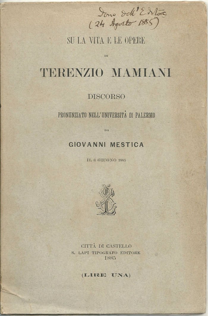 In 16, p. [4], 107, br. orig. a fogli chiusi, ex-libris a timbretto sul front. (Pietro Vigo). - Dedica autografa dell'a. sulla cop. ant.