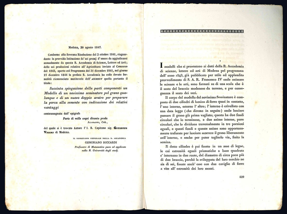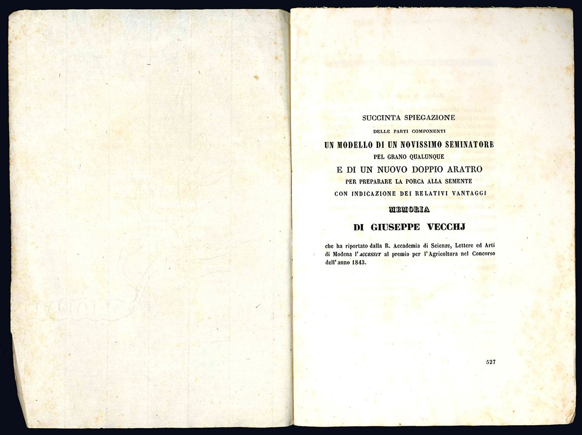 Succinta spiegazione delle parti componenti un modello di un novissimo seminatore pel grano qualunque e di un nuovo doppio aratro per preparare la porca alla semente con indicazione dei relativi vantaggi. Memoria di Giuseppe Vecchj.
