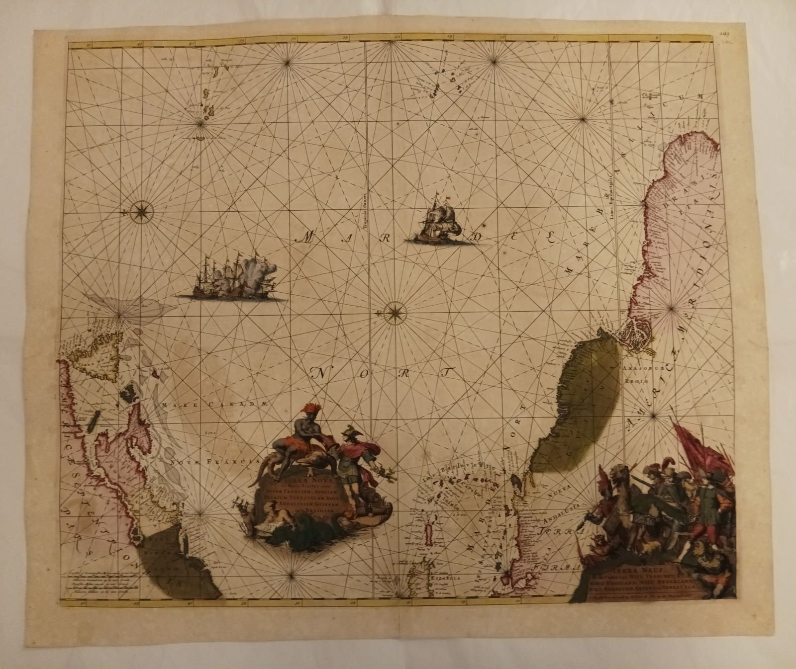 Bella e rara carta nautica, tratta dal celebre atlante di De Witt ''Orbis Maritimus ofte Zee Atlas“, che mostra l'Oceano Atlantico a ovest delle Azzorre e delle isole di Capo Verde e le coste del Nord America nord-orientale e del Sud America settentrionale. La carta è orientata con il nord a sinistra. Le indicazioni toponimiche e le caratteristiche geografiche sono strettamente limitate alle coste. Rosa dei venti, linee lossodromiche e due cartigli decorativi in, uno in basso in centro e uno a destra, con varie figure, anche allegoriche, nativi e animali locali, che includono il titolo in latino e in olandese.