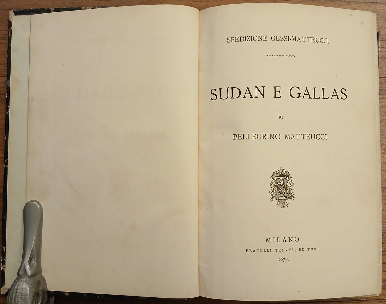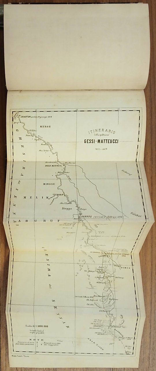 In 16° grande (cm 18 x 12,5), legatura coeva in mezza pergamena, dorso a 4 nervi con impressioni in oro, tassello in pelle nera con titoli dorati, pp. (8),303,(1), con una carta itineraria più volte ripiegata fuori testo, in testa al frontespizio "Spedizione Gessi - Matteucci". Primo viaggio africano di Pellegrino Matteucci : una spedizione commerciale nel Sudan dall'ottobre 1877 al luglio 1878 con il compagno Romolo Gessi. Edizione originale. Ottimo stato di conservazione.