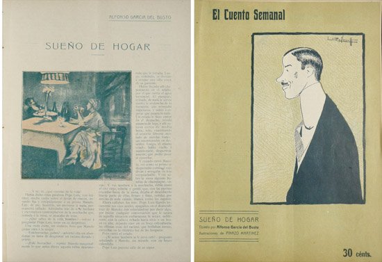 Madrid, El Cuento Semanal, 1909. Folio; 10 hs. sin paginar, impresas a doble columna y con ilustraciones entre el texto de Pinazo Martínez. Cubiertas originales Santana Bonilla.