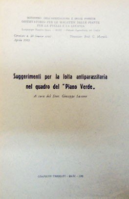 Suggerimenti per la lotta antiparassitaria nel quadro del ‘Piano Verde’, a cura di Giuseppe Laccone, Grafiche Cressati, Bari 1962, pp. 7 (11), cm 25, fascicolo spillato. In testa al frontespizio: Ministero dell’Agricoltura e delle Foreste, Osservatorio per le malattie delle piante per la Puglia e la Lucania – Bari, Circolare n. 20 (nuova serie), aprile 1962. Lievissimi segni del tempo, qualche sporadica traccia di biro, per il resto ben conservato.