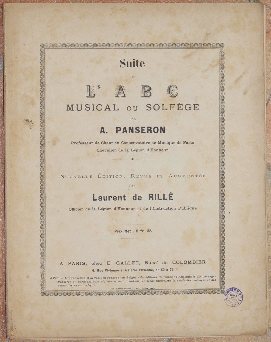In 4. Dim. 34x27 cm. Pp. 107. Edizione della fine del XIX secolo, inizi '900 di questo studio di solfeggio del compositore e insegnante francese Auguste Mathieu Panseron (1796-1859).PAnseron fu insegnante di solfeggio poi di canto al Conservatorio di Parigi. In buone condizioni. Copertina assente. Legatura in discrete condizioni con rotture. All'interno le pagine si presentano in buone condizioni con fioriture.