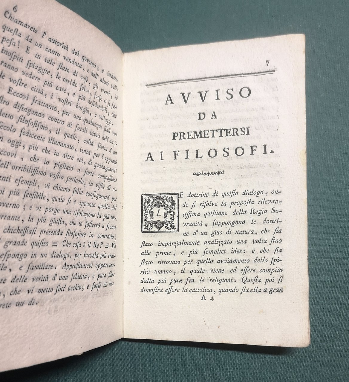 >in-12, pp. 66, legatura in cartoncino rustico coevo. Probabile edizione originale. L'opuscolo anonimo e rarissimo è attribuito a Falletti, teologo e storico italiano, da Giuseppe Antonio Ganora in "Osservazioni politico-governative" (Casale, Casuccio, 1849). L'opera consiste in un dialogo filosofico sulla figura del Re e la funzione della monarchia. Perfetto esemplare, fresco e genuino. Non in Melzi-Passano.