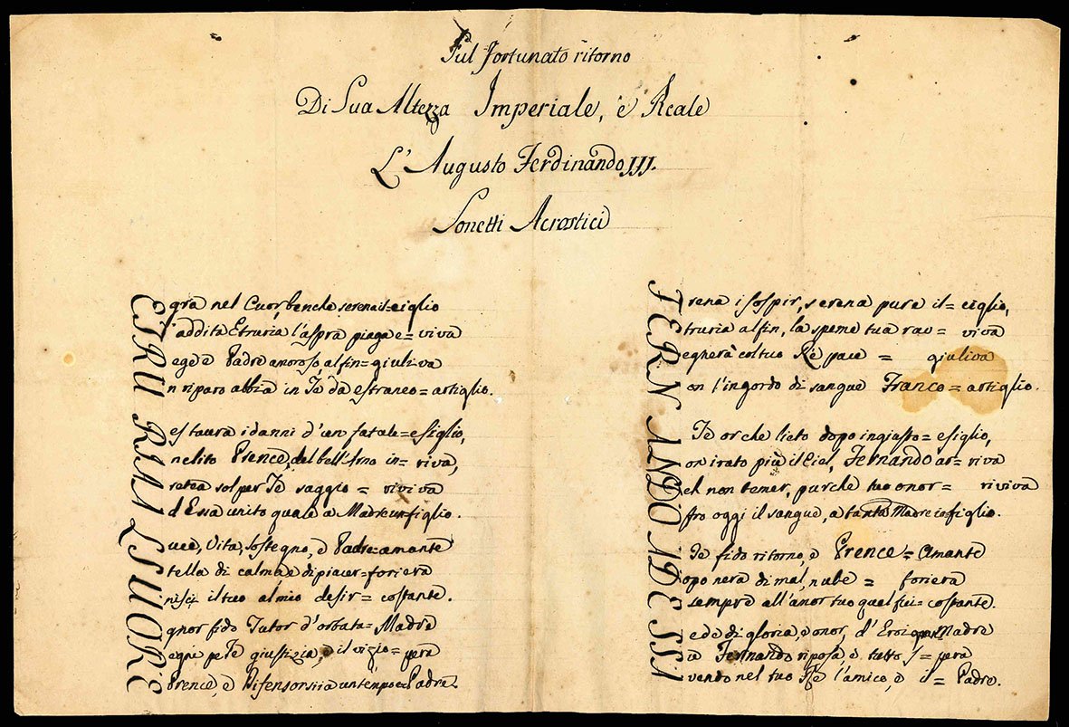 Bifolio manoscritto (mm 245x182), bianco il recto della prima e il verso della seconda carta. Sonetti acrostici che formano le frasi: “Etruria al suo re” e “Fernando ad essa”. Carta uniformemente ingiallita, qualche macchia. Bella filigrana raffigurante una figura alata che sostiene un nastro riportante la scritta “Al Paradiso” (contromarca: “AC”).