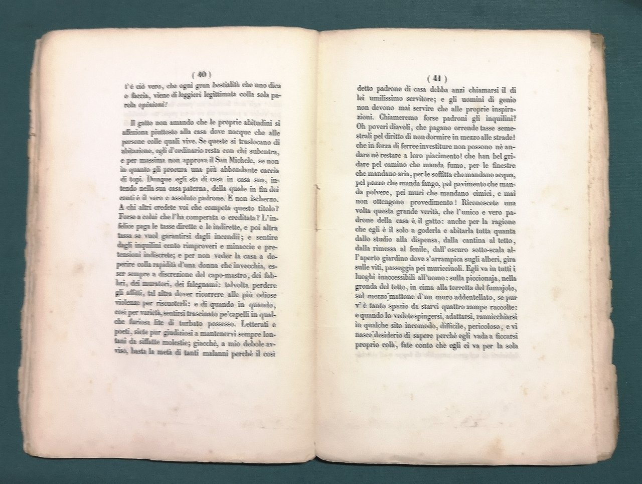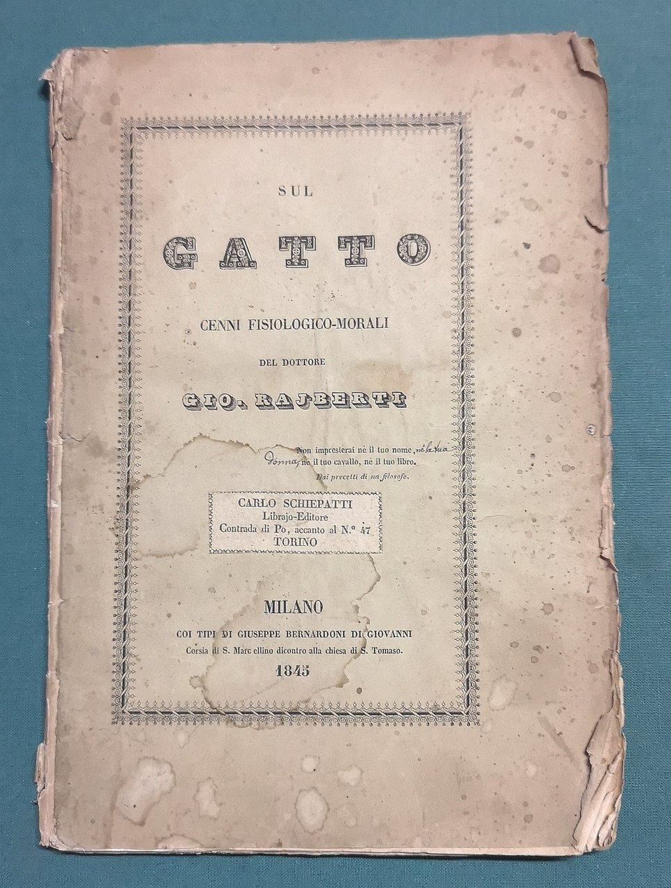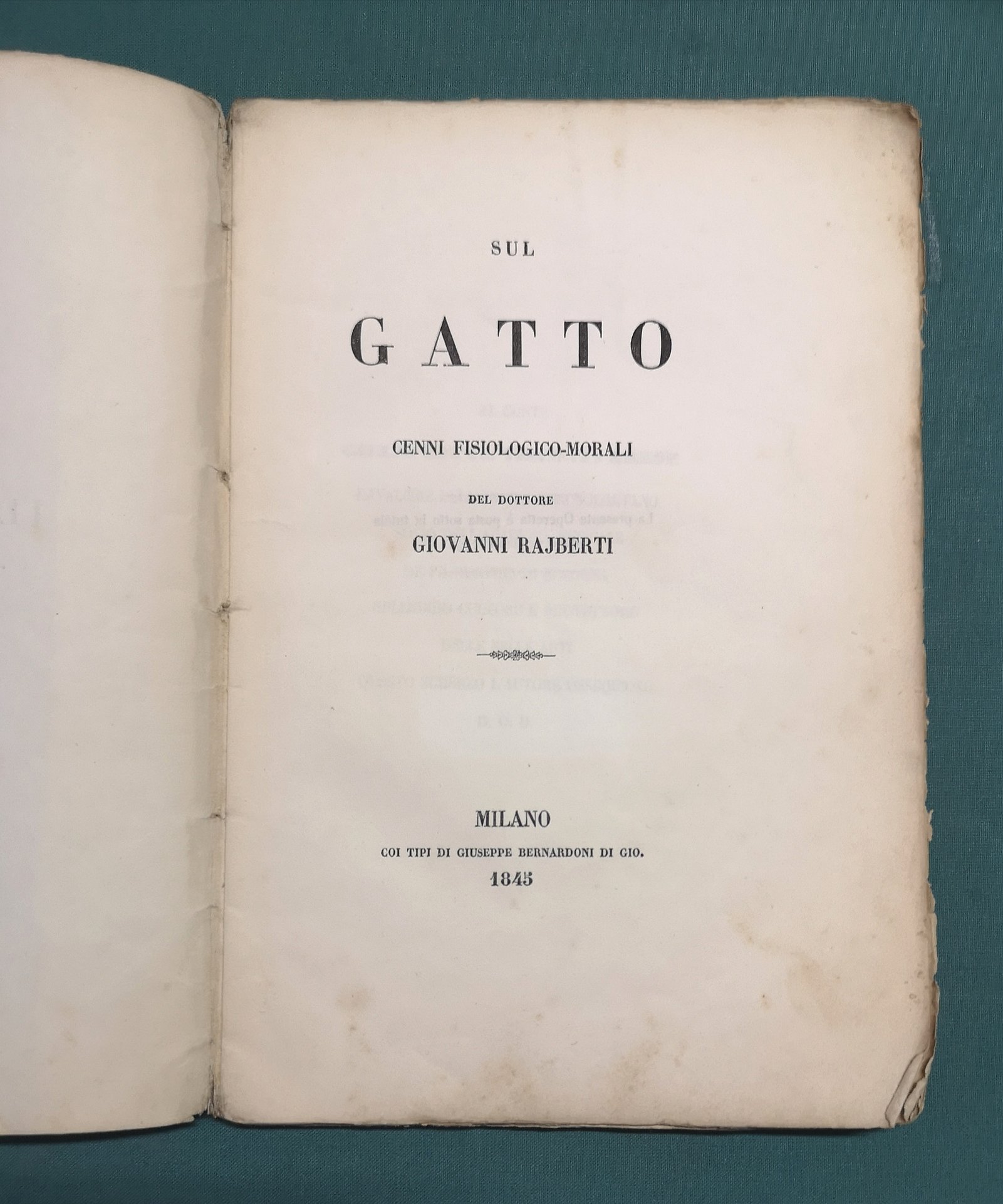 >in-8, pp. pp. 86, (2), broch. edit., titolo entro cornice al piatto ant. (dorso con mancanze). Prima edizione di questo divertente trattato sul gatto domestico, considerato il capolavoro dell'autore milanese. Se Baudelaire fu il poeta del gatto, Rajberti ne fu lo psicologo. L'operetta ebbe nel 1845 una prima tiratura limitata: le copie vendute salirono a 3500 con la seconda edizione del 1846, la quale includeva l'appendice La coda, che il Rajberti scrisse in risposta a un articolo astiosamente critico comparso sul «Corriere delle Dame» del 18 gennaio 1846. Discreto esemplare, a pieni margini, fogli diseguali, in barbe, piuttosto fresco salvo minime e marginali arrossature.