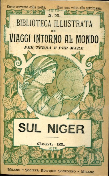 In-8°, pp. 32, brossura editoriale con bella illustrazione policroma di gusto Liberty con una figura femminile che sorregge un globo terrestre e ricchi decori a fogliame. Illustrazioni fototipiche n.t. Perfetto stato. Prima edizione italiana de La boucle du Niger. Resoconto della celebre missione africana di Louis Gustave Binger. Biblioteca illustrata dei viaggi intorno al mondo per terra e per mare, n. 55 (si tratta della fedele riproposizione in veste italiana della Bibliothèque illustrée des voyages autour du monde par terre et par mer diretta dal Simond).