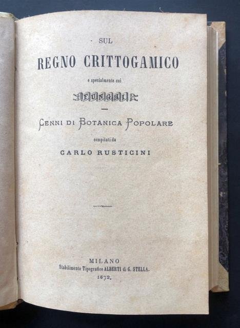 Stabilimento Tipografico Alberti di G. Stella, Milano, 1872 / De Macchi e C. Editori della Biblioteca Istruttiva Popolare, 1872. In 12esimo (cm 11 x 15,5 alla legatura), occhietto, front., pp. 328 (con Indice); 110 + 1 di pubblicità editoriale. Leg. orig. in buon cartonato marezzato, dorso in perg. con titoli oro su tassello marrone. L’elenco dei funghi e delle specie citate nelle due compilazioni è sempre chiaramente elencato con numero e (per quanto riguarda i funghi) con titolo scientifico in latino scritto in neretto. Si parla anche di vipere, di specie botaniche varie, come patate, olivo, pero, trifoglio, gelso, albicocco, lino , vite e molto altro. Pagine uniformemente ma solo leggermente ingiallite, bell’esemplare in ottimo stato di conservazione.