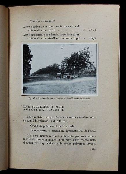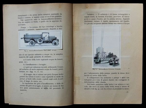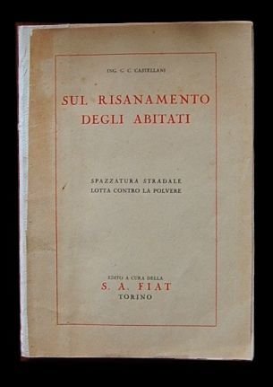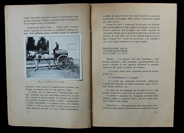 23,5x16 cm; 46, (2) pp. Brossura editoriale con titolo in rosso e nero entro cornice xilografica rossa. Piatti applicati su rinforzo in cartoncino. Prima edizione non comune. Pubblicazione monografica arricchita da numerose figurine applicate a mano che riproducono vari automezzi FIAT-SMIT come l'Autoannafiattrice A I 603 o la A I 503 F,. L'opera suggerisce ed anticipa, l'istituzione di un servizio di pubblica pulizie delle strade che sfrutterebbe i nuovi mezzi FIAT, spiegando i vantaggi dei nuovi mezzi, il loro funzionamento, le loro caratteristiche tecniche e il modo migliore per organizzare il servizio. Piccole pecette di adesivo trasparente al margine interno bianco di 6 pagine (ininfluente) a chiudere un piccolissimo strappetto senza perdita di carta e per il resto, opera in buono stato di conservazione e stampato su carta forte di ottima qualità. Opera curiosa di interesse per la storia del ruolo della FIAT in Italia.