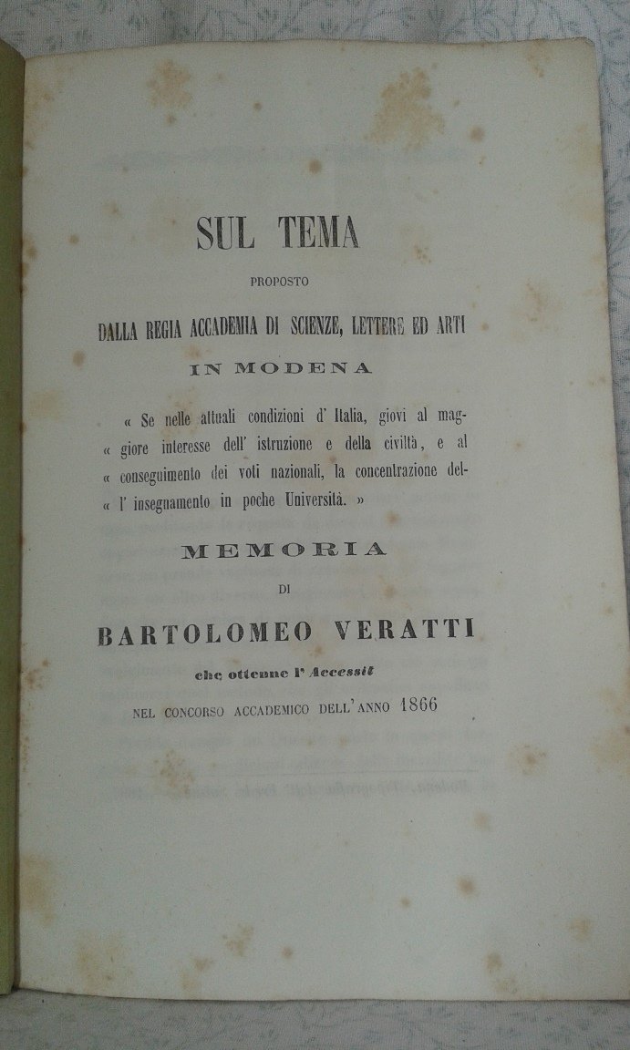 Opuscolo in 8, brossura muta, frontespizio, 35 pp. Tema intitolato ' Se nelle attuali condizioni d'Italia, giovi al maggior interesse dell'istruzione e della civilt, e al conseguimento dei voti nazionali, la concentrazione dell'insegnamento in poche Universit.' Sporadica fioritura della carta, in buono stato, intonso, interessante.