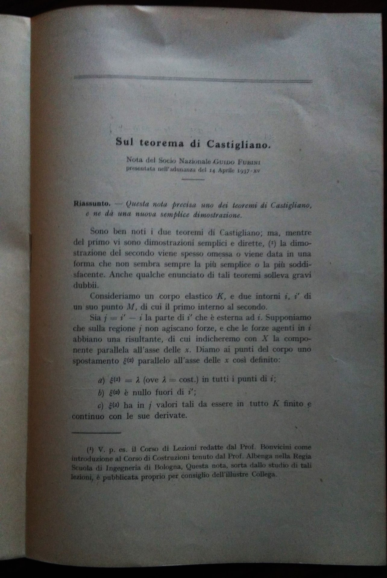 SUL TEOREMA DI CASTIGLIANO. TORINO, R. ACC. SCIENZE, 1937.