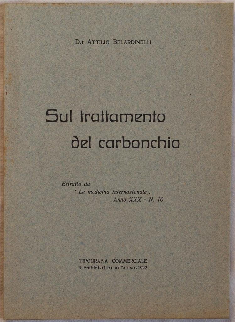In 8. Dim. 21x15 cm. Pp. (2). Interessante pubblicazione del 1922 sul trattamento del carbonchio scritto da Attilio Belardinelli. Estratto da "La medicina internazionale" anno XXX n. 10. In ottime condizioni.Copertina editoriale in ottime condizioni generali con lievi usure ai margini e dorso. Legatura in ottime condizioni. All'interno le pagine si presentano in ottime condizioni con rare fioriture. Interesting pamphlet of 1922 about the treatment of anthrax written by Attilio Belardinelli. Extract from the "La medicina internazionale" year XXX n. 10. In very good conditions. Editorial cover in very good general conditions slightly worn in the edges and spine. Binding in very good conditions. Inside pages are in very good conditions with occasional foxings.