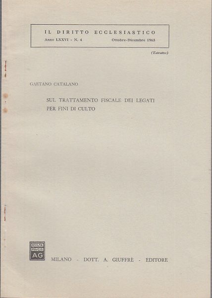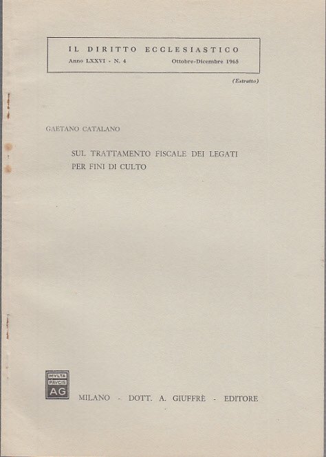 In-8 (Cm 24,5 x 17,2), pp. da 415 a 422, brossura editoriale. Estratto "Il diritto ecclesiastico". Autografo dell'autore al frontespizio. Mancanza nella parte alta del frontespizio che conteneva originariamente una dedica. BUONO