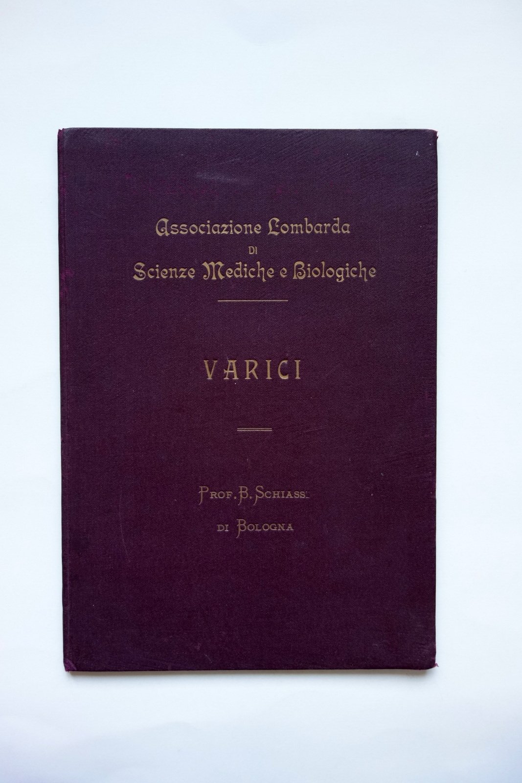 Prof. B. Schiassi, Sul trattamento moderno italiano" delle varici - comunicazione fatta alla Società Lombarda di Scienze Mediche e Biologiche in Milano l'8 giugno 1928 Tip. Antonio Cordani, Milano 1929; cm 31,5x21,5; pp. 40 con 7 figure in b/n fuori t.; tutta tela ed. con titolo impresso in oro al piatto ant. Condizioni di conservazione Ben conservato con tracce d'uso; coperta minimamente sgualcita agli angoli e al dorso, con pochi lievi aloni al piatto posteriore. Interni buoni; qualche pagina di testo leggermente ingiallita. Leggere bruniture ai risguardi. Catalogo dell'omonima mostra tenutasi nei locali espositivi di Villa Fabriani a Spilamberto il 13 ottobre 1996. SETT13.L23901 N "