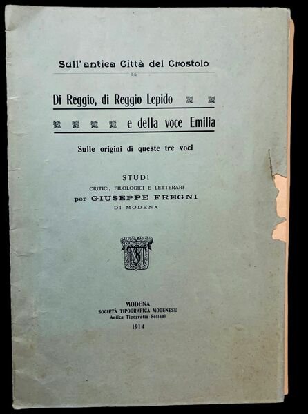 In 4°; 24, (4) pp. Brossura editoriale con piccola mancanza al margine esterno bianco del piatto anteriore e per il resto esemplare in buone-ottime condizioni di conservazione. Prima edizione di questa monografia dedicata all'antica città di Crostolo in provincia di Reggio-Emilia, scritta dal noto critico, filologo e letterato modenese, Giuseppe Fregni.