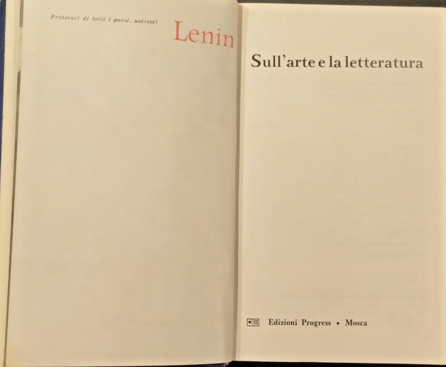 SULL'ARTE E LA LETTERATURA di Nicolai Lenin. Edizioni Progress, 1977. 400 pagine, fotografie in bianco e nero fuori dal testo. Copertina editoriale in tutta finta pelle. Stato di conservazione: molto buono (pagine normalmente ingiallite) Libro usato saggistica politica comunismo