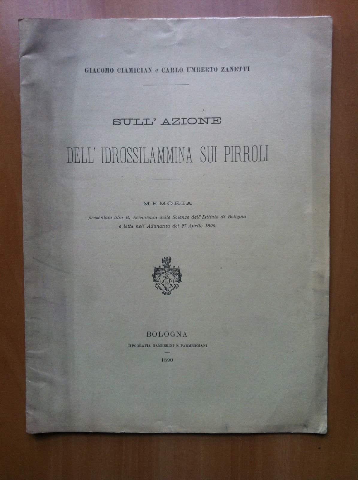 SULL'AZIONE DELL'IDROSSILAMMINA SUI PIRROLIGiacomo Ciamician e Carlo Umberto ZanettiMemoria presentata alla R. Accademia delle Scienze dell'Istituto di Biologna e letta nell'Adunanza del 27 Aprile 1890ottime condizioni - 23 pagine formato 22,5x30,5 cm(95 g)E15084