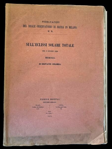 In folio; 26 pp. e una c. di tav. fuori testo con percorso delleclissi solare. Brossura editoriale arancione con titolo, autore, stampatore e anno di stampa inciso in nero al piatto anteriore. Prima edizione in ottime condizioni di conservazione di questo scritto astronomico dedicato alleclissi del 3 giugno del 1239, dal noto astronomo, accademico e politico italiano, Giovanni Celoria (Casale Monferrato, 29 gennaio 1842 Milano, 17 agosto 1920). Lautore, laureatosi alla Scuola di Applicazione per gli Ingegneri di Torino nel 1863, lavorò sotto la direzione di Giovanni Virginio Schiapparelli presso lOsservatorio Astronomico di Brera, per tutta la vita. Nel 1900 divenne Direttore dellOsservatorio Astronomico di Brera prendendo il posto di Schiapparelli, abbandonandola solo nel 1917, quando si ritirò a vita privata. Insieme allattività di ricerca presso lOsservatorio Astronomico, insegnò Geodesia al Regio Istituto Tecnico Superiore di Milano, divenendo anche presidente della Commissione geodetica italiana. Fu socio di diverse prestigiose accademie come lAccademia dei Lincei, della Società italiana di scienze naturali, della quale fu anche direttore e dellIstituto Lombardo Accademia di Scienze e Lettere. Nel 1909 divenne Senatore del Regno dItalia. In questopera lautore ricostruisce le fonti storiche di questa eclisse e gli aspetti astronomici della stessa. Prima ed unica edizione, in ottime condizioni di conservazione. Rif. Bibl.: ICCU: IT\ICCU\MIL\0684201.