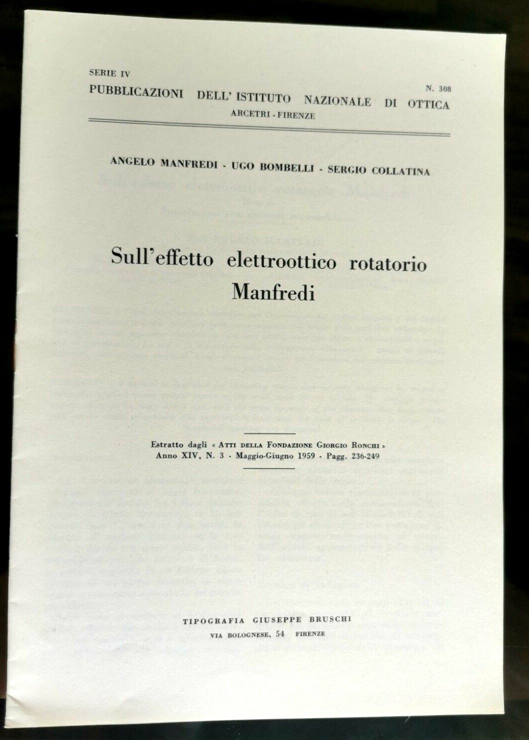 SULL'EFFETTO ELETTROOTTICO ROTATORIO MANFREDI di Collatina Bombelli 1959 Libro