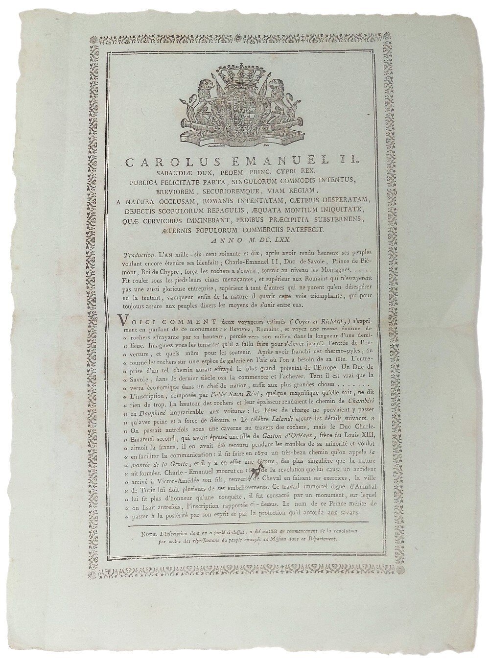 >Foglio sciolto (390x280 mm), impresso su carta cerulea. Testo entro cornice tipografica, sormondato da stemma Savoia in xilografia. Rarissimo. Trascrizione e descrizione dell'epigrafe posta sul monumento celebrativo della Via Sarda (Voie Sarde), realizzata da Carlo Emanuele per rendere carrozzabile la "Défilé des échelles" in Savoia. Questo stretto passaggio tra i monti era il principale asse di comunicazione tra Lione e Torino, usato fin dal tempo dei romani, era detto delle "Scale" perché prima della costruzione della rampa, i carri venivano scaricati e trasportati a dorso d'uomo nelle gole, giacché i passaggi rocciosi erano dotati di scale, le merci venivano poi ricaricate sui carri. Carlo Emanuele II, Duca di Savoia, decise di trasformarla in una strada reale carrozzabile grazie ad una rampa di circa 400 metri che permettesse di raggiungere la sottostante pianura delle Echelles. Poiché la Savoia faceva parte del Regno di Piemonte-Sardegna, questo passaggio prese il nome di Voie Sarde; fu percorsa da illustri viaggiatori come Jean-Jacques Rousseau o Papa Pio VII che si recava in Francia per incoronare Bonaparte imperatore. Fu proprio Napoleone, nel 1804, ad avviare la perforazione del tunnel delle Scale consideranto il percorso troppo impervio. Il monumento in onore di Carlo Emanuele II, qui descritto, fu eretto nel 1674. Ottimo esemplare, lievissime fioriture ai margini, segno di piegatura centrale.