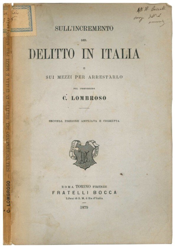 Mm. 206x135. Pp. VII, 156. Esemplare ancora a fogli chiusi, in barbe. C. uniformemente brunita. Brossura editoriale, cop. lievemente brunita e macchiata. Invio autografo alla punta sup. della cop. ant.: 'All'Ill. Baccelli omaggio dell'autore ammiratiss. (?)'. Probabilmente Cesare Lombroso invia questa sua opera a Guido Baccelli (1830-1916), sette volte ministro della pubblica istruzione e una volta ministro dell'agricoltura, dell'industria e del commercio; oltre che ordinario di clinica medica e direttore della clinica S. Spirito, a Roma. Seconda edizione ampliata e corretta.