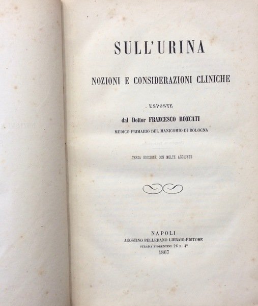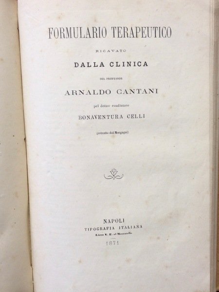 Volume in mezza tela rossa, piatti cartonati rigidi, pp 160. Il volume include anche il FORMULARIO TERAPEUTICO RICAVATO DALLA CLINICA DEL PROFESSORE ARNALDO CANTANI, Napoli, 1871, pp 90.